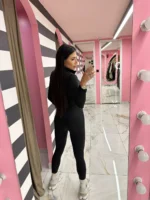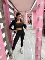 Μαύρο αθλητικό σετ με push-up κολάν που δεν διαγράφει και προσφέρει τέλεια εφαρμογή. Ελαστικό ύφασμα που αγκαλιάζει το σώμα και ζακετάκι με φερμουάρ για stylish gym ή casual εμφανίσεις.