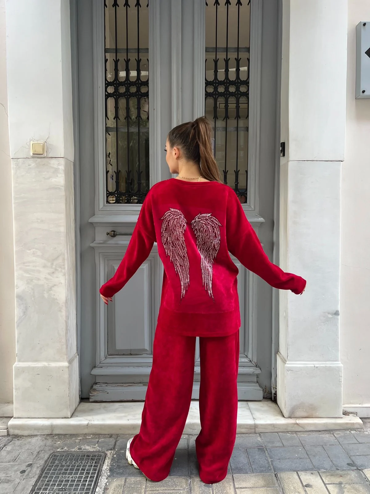 Εντυπωσιακό μπορντό βελούδινο σετ με φτερά στην πλάτη που τραβά τα βλέμματα. Ζεστό, απαλό και με elegant λάμψη — το πιο glam cozy look του χειμώνα.