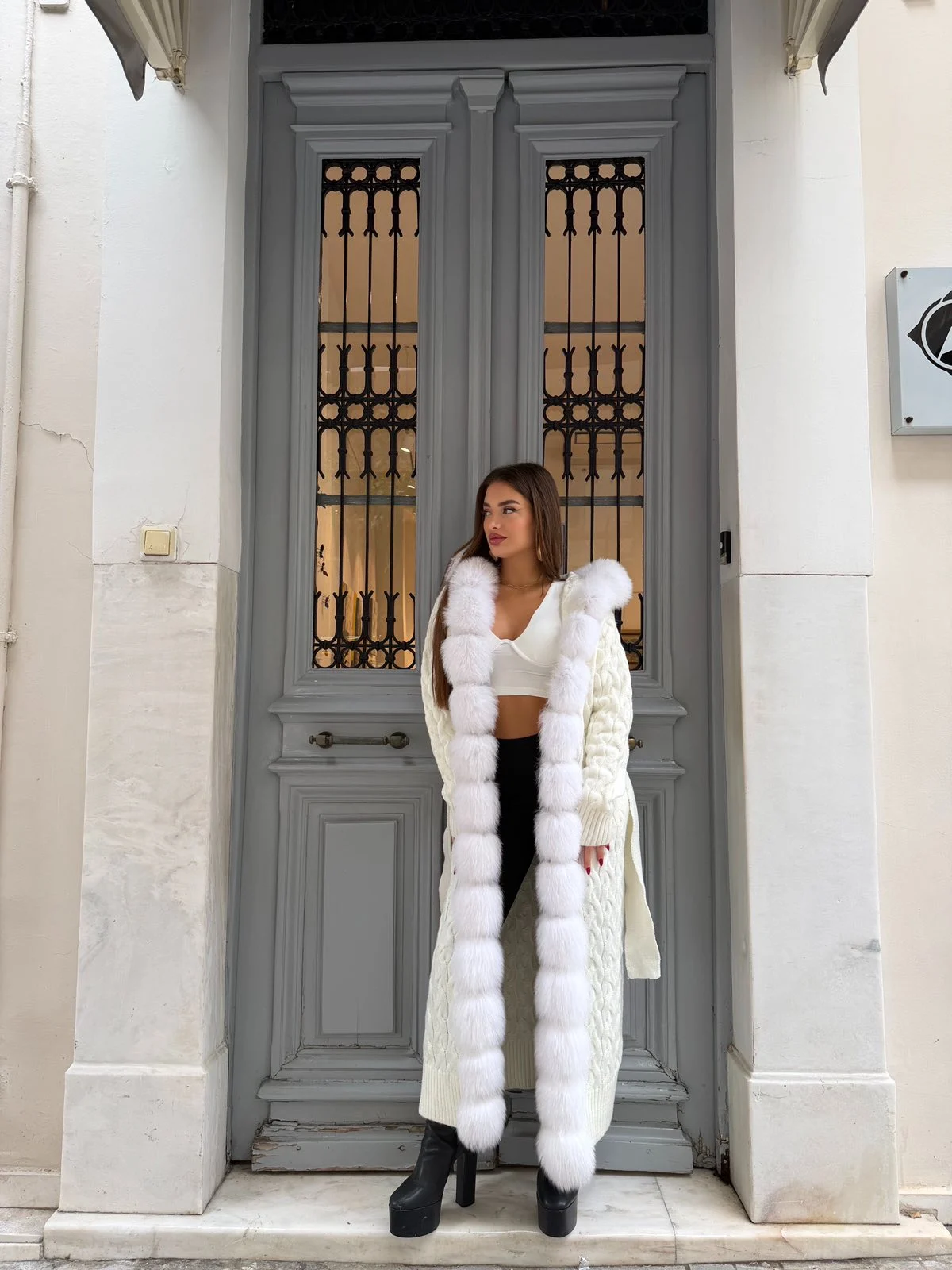 Ζακέτα πολυτελείας με αληθινή γούνα και μοναδική πλέξη. Εξαιρετικής ποιότητας ύφασμα, απόλυτα ζεστή και φίνα, ιδανική για κομψές εμφανίσεις που τραβούν όλα τα βλέμματα. Διαθέτει ζώνη στη μέση και πλούσιο γιακά από αυθεντική γούνα για απόλυτα elegant αποτέλεσμα.