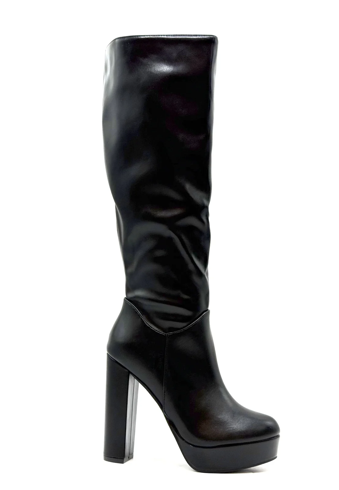 Ψηλή μαύρη μπότα με χοντρό σταθερό τακούνι και ενσωματωμένη πλατφόρμα για έξτρα άνεση και ύψος. Διαχρονικό glossy δερματίνη εφέ, soft εφαρμογή στη γάμπα και minimal design που ταιριάζει με φορέματα, φούστες και skinny παντελόνια. Statement κομμάτι για εντυπωσιακές εμφανίσεις.