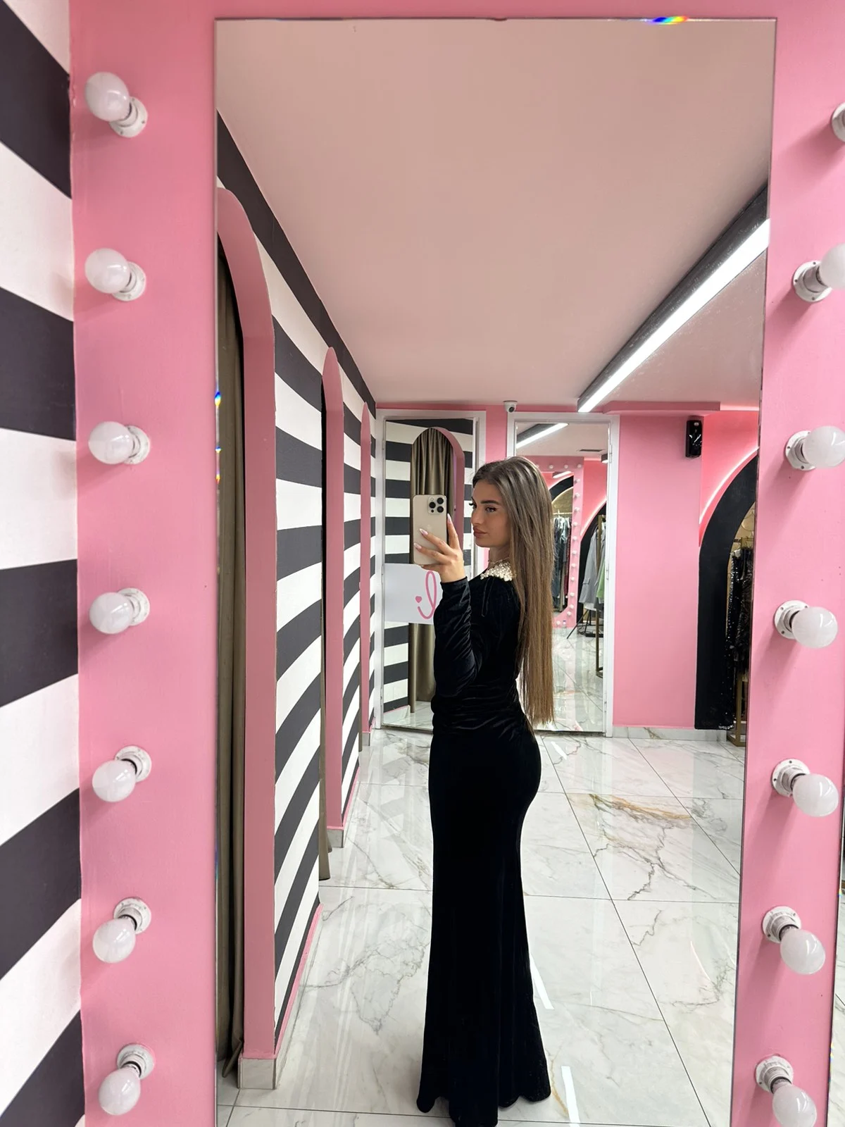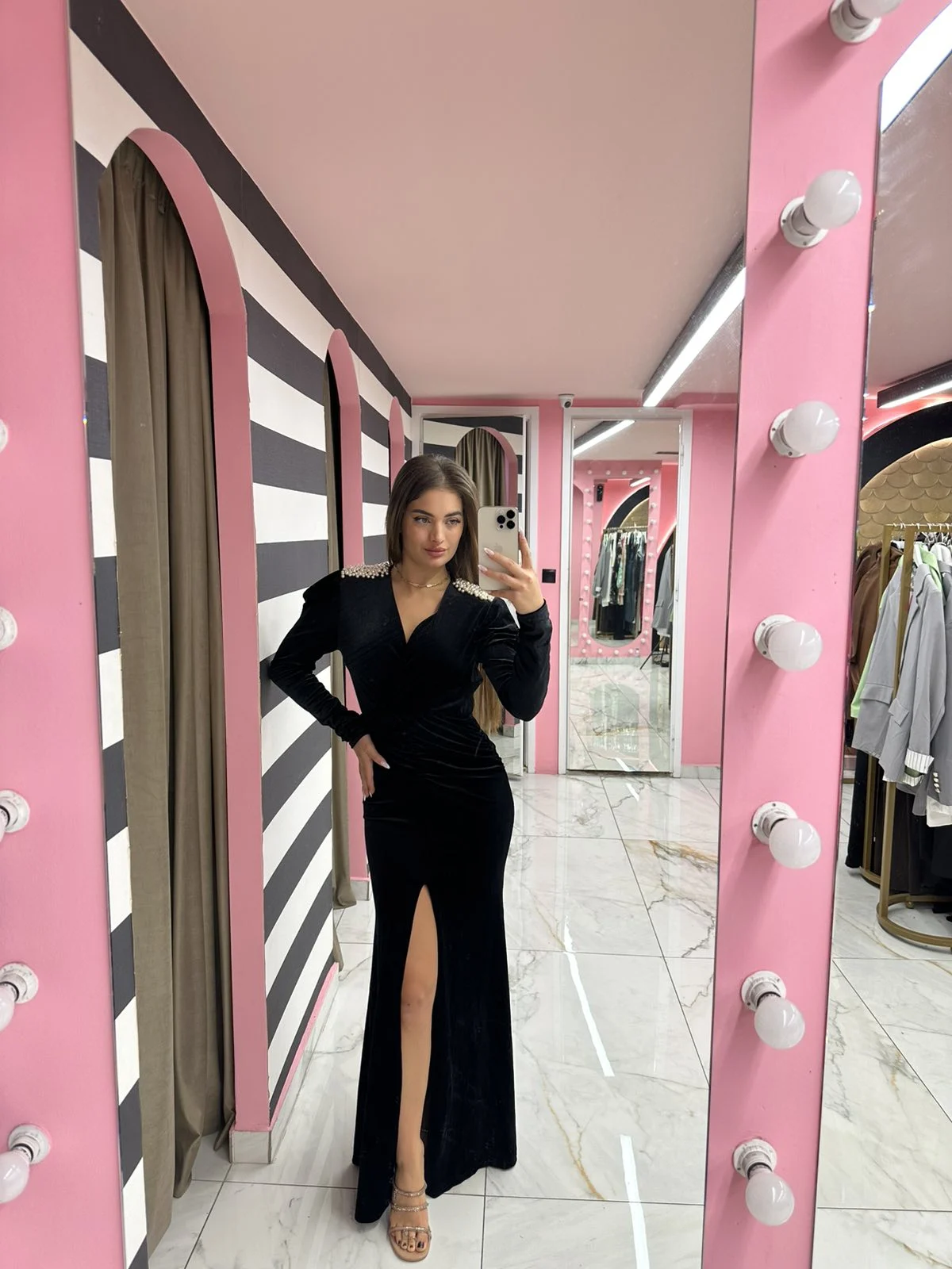 Μαύρο βελούδινο μάξι φόρεμα με βαθύ V, χρυσές & λαμπερές λεπτομέρειες στους ώμους και εντυπωσιακό άνοιγμα στο πόδι. Αγκαλιάζει υπέροχα τη σιλουέτα και χαρίζει απόλυτη κομψότητα και πολυτέλεια. Ιδανικό για βραδινές εμφανίσεις και ειδικές περιστάσεις.