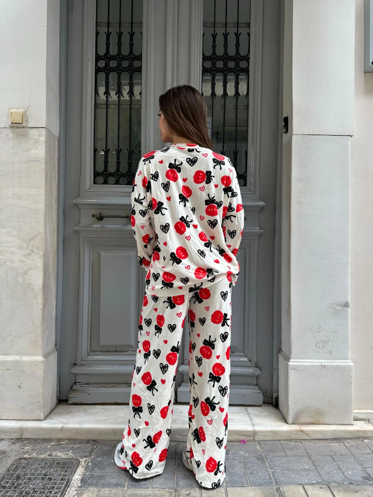 Εκρού βελούδινη πιτζάμα με κόκκινα μήλα και μαύρα φιογκάκια — girly και παιχνιδιάρικη. Πολύ απαλή και ελαστική, με λάστιχο στη μέση για τέλεια εφαρμογή έως 3XL.