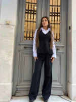 Ένα statement σετ σε μαύρο χρώμα που συνδυάζει κομψότητα και δυναμισμό. Περιλαμβάνει λευκό πουκάμισο με κλασική γραμμή και μαύρο γιλέκο με δέσιμο στη μέση, συνδυασμένο με wide-leg παντελόνι για απόλυτα chic αποτέλεσμα. Ιδανικό για καθημερινές αλλά και βραδινές εμφανίσεις, γραφείο ή έξοδο.