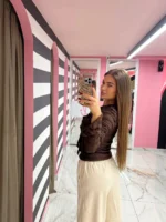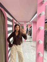 Ριπ μπλούζα σε σοκολατί απόχρωση με εντυπωσιακό βολάν και δέσιμο στο λαιμό. Αγκαλιάζει το σώμα με θηλυκό τρόπο και ταιριάζει τέλεια με παντελόνια σε nude ή μπεζ τόνους για elegant casual εμφανίσεις.