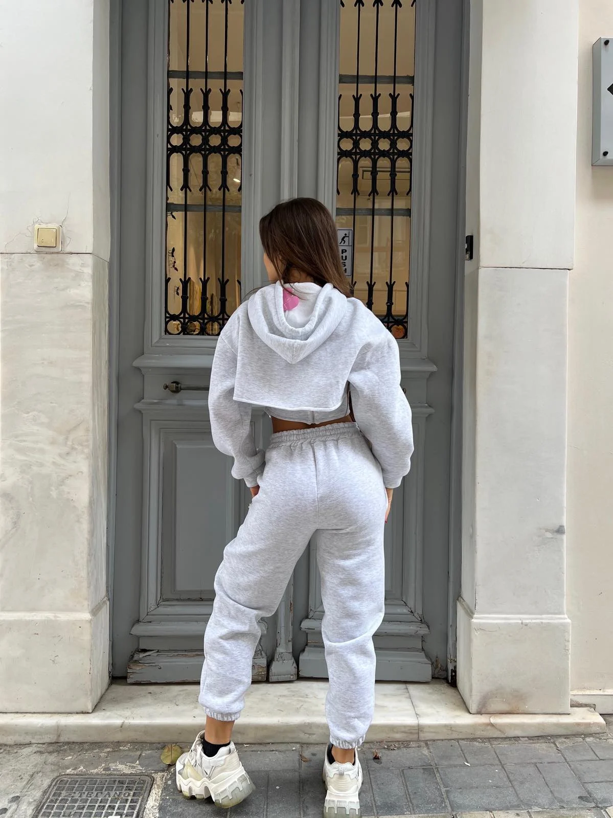 Φωτεινό και άνετο σετ σε απαλό γκρι χρώμα. Η τέλεια επιλογή για cozy εμφανίσεις με στυλ, από το σπίτι μέχρι τη βόλτα.
