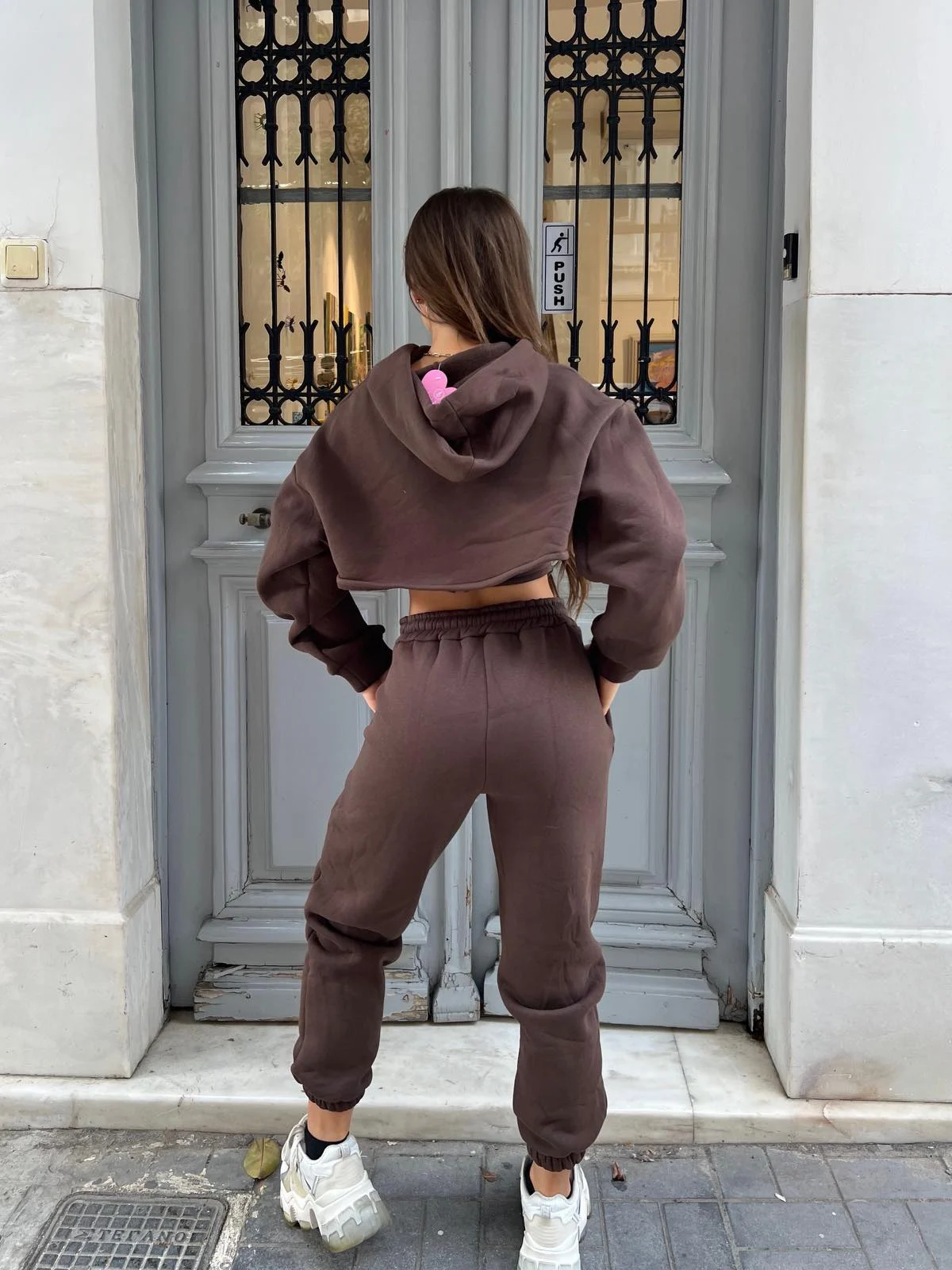 Σετ σε γήινο καφέ χρώμα που αποπνέει ζεστασιά και φινέτσα. Το cropped bolero και το τοπ με ίσια γραμμή δίνουν μοντέρνο χαρακτήρα στο πιο άνετο loungewear.