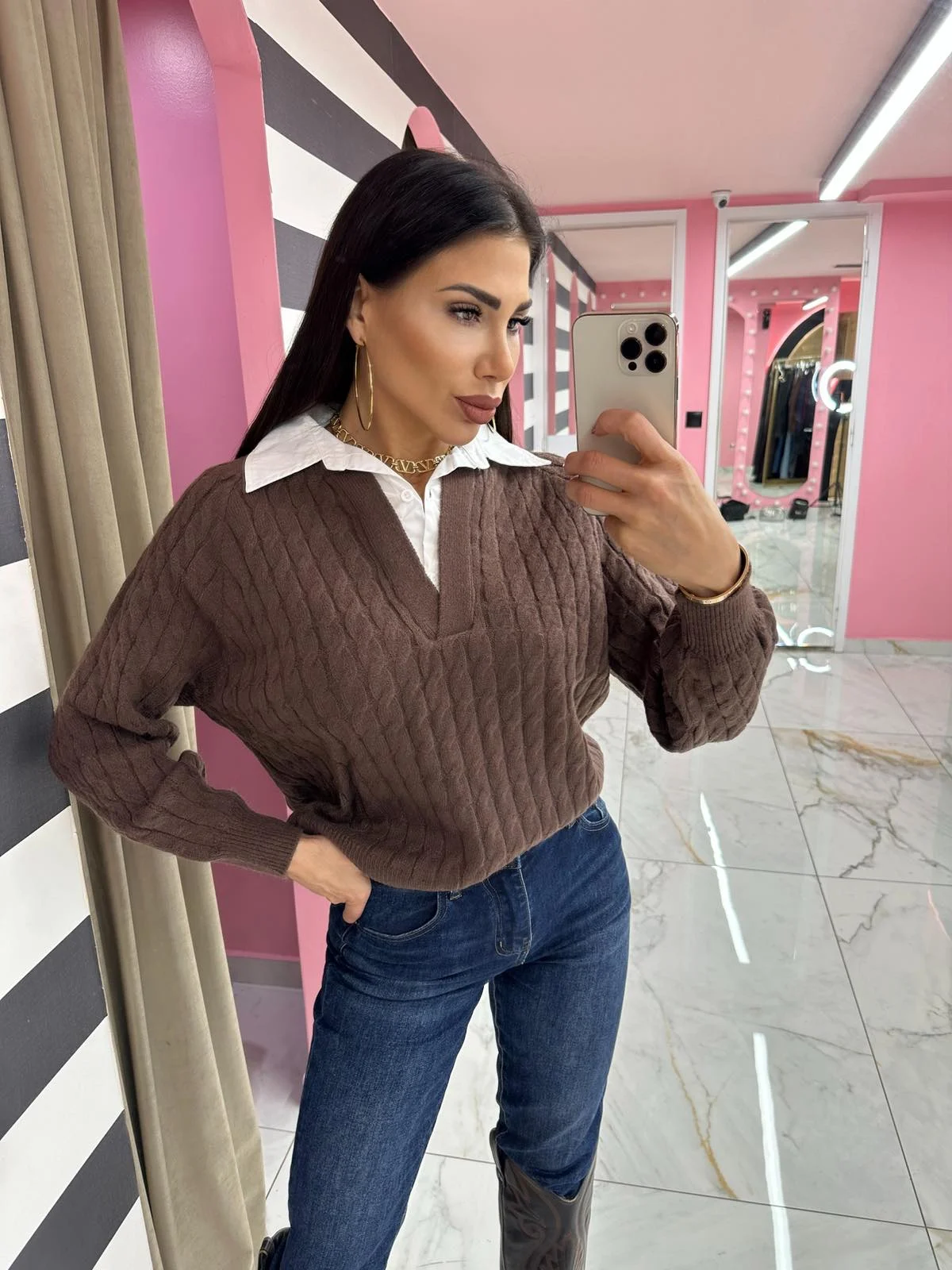 Πλεκτή μπλούζα με ανάγλυφη πλέξη και V λαιμόκοψη σε elegant cocoa απόχρωση. Μαλακή υφή, άνετη εφαρμογή και διαχρονικό στυλ που συνδυάζεται τέλεια με πουκάμισο από μέσα ή και μόνη της για πιο casual look.