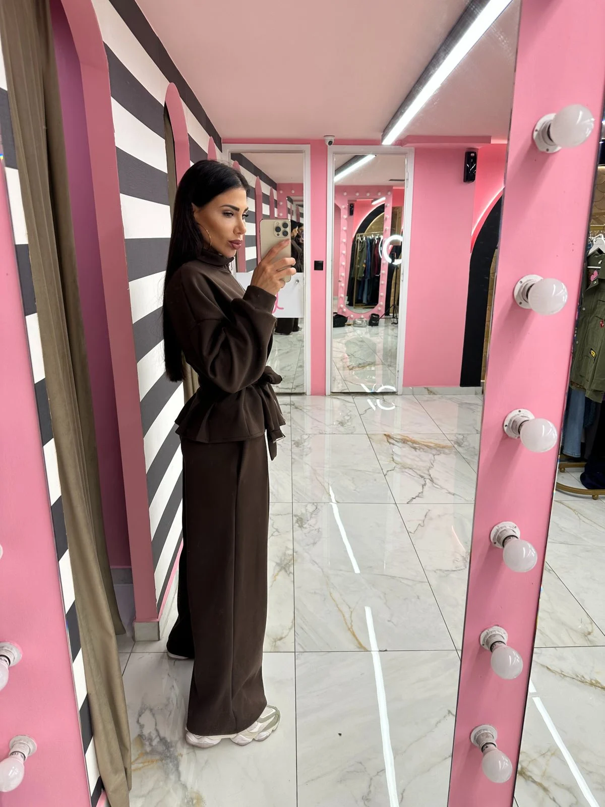 Σετ δύο τεμαχίων σε σοκολατί απόχρωση με φερμουάρ και ζώνη στη μέση. Παντελόνι σε wide leg γραμμή και ψηλή μέση που κολακεύει, ενώ το πάνω μέρος χαρίζει minimal chic ύφος. Άνετο και στυλάτο, ιδανικό για κάθε στιγμή της ημέρας.