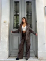 Σοκολατί απόχρωση που εκπέμπει κομψότητα και ζεστασιά. Το σετ περιλαμβάνει σακάκι με φόδρα και παντελόνι με λάστιχο στη μέση για τέλεια εφαρμογή. Must-have επιλογή για κομψές εμφανίσεις από το πρωί έως το βράδυ.