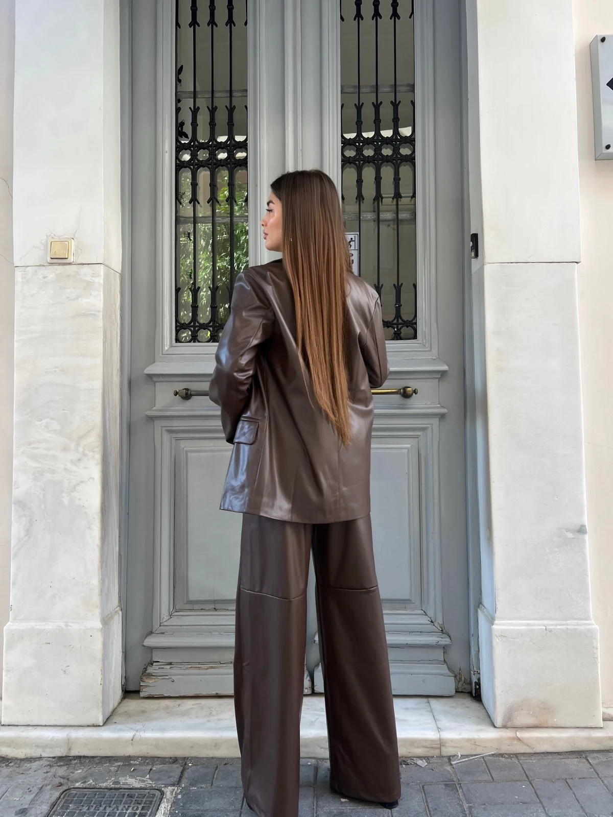 Σοκολατί απόχρωση που εκπέμπει κομψότητα και ζεστασιά. Το σετ περιλαμβάνει σακάκι με φόδρα και παντελόνι με λάστιχο στη μέση για τέλεια εφαρμογή. Must-have επιλογή για κομψές εμφανίσεις από το πρωί έως το βράδυ.