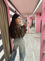 Δερμάτινο τζάκετ σε πλούσια σοκολατί απόχρωση με ζωνάκι στη μέση και μοντέρνο κοντό κόψιμο.