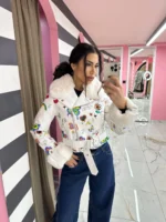 Λευκό jacket με ζωγραφιστές λεπτομέρειες, εσωτερική γούνα και γούνινο γιακά που προσθέτει έξτρα στιλ και ζεστασιά.