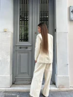 Αριστοκρατικό εκρού σετ που αποπνέει φρεσκάδα και κομψότητα. Το σακάκι και το παντελόνι του δημιουργούν έναν φωτεινό, elegant συνδυασμό που ξεχωρίζει σε κάθε περίσταση.
