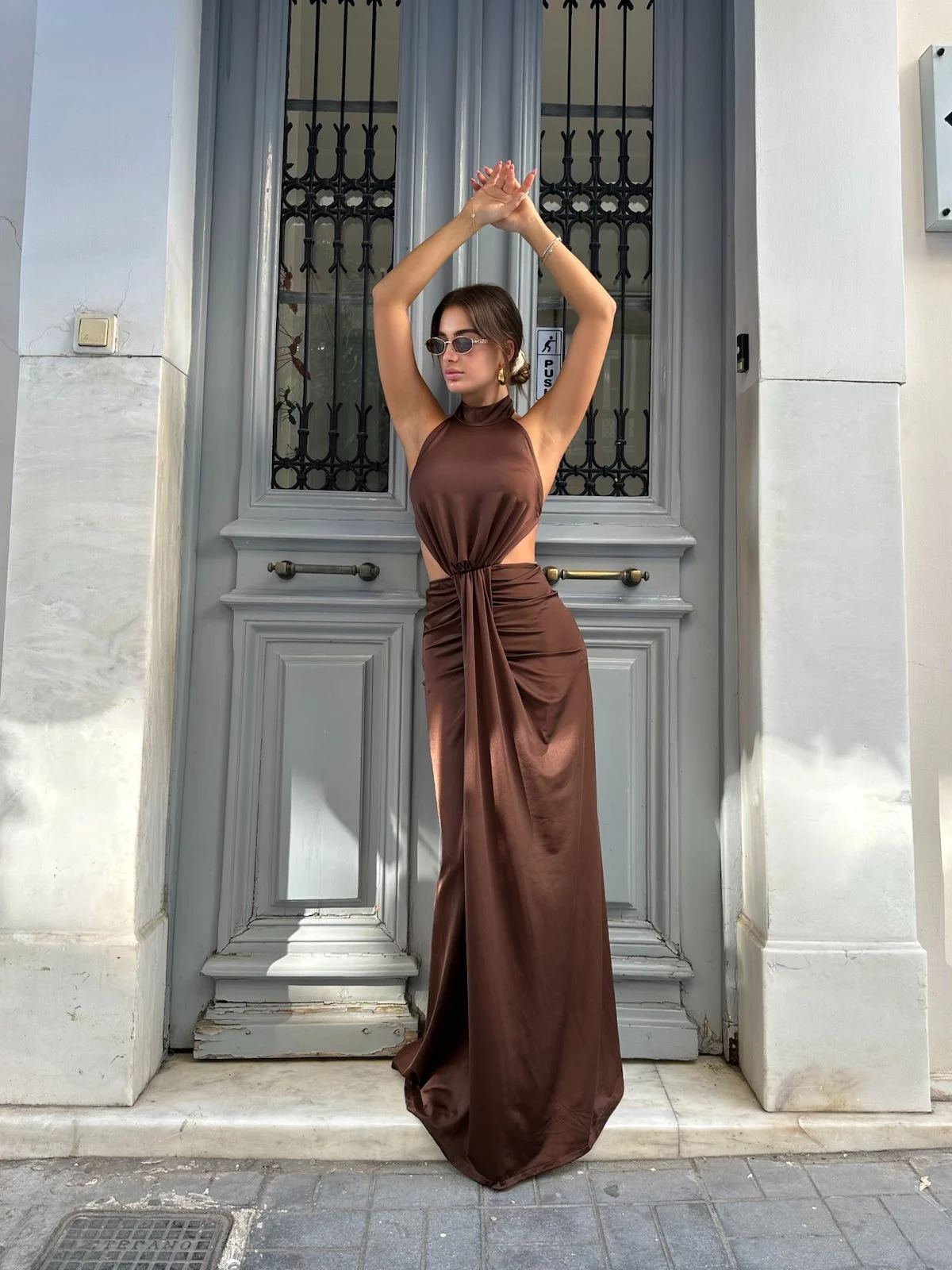 Maxi φόρεμα με halter λαιμόκοψη, δέσιμο στη μέση και ανοιχτά πλαϊνά. Η γήινη καφέ απόχρωση το κάνει ιδανικό για κομψές και σοφιστικέ εμφανίσεις.