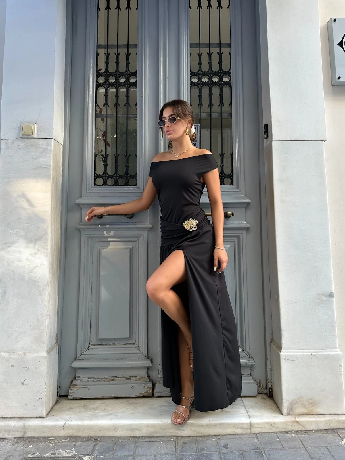 Maxi φόρεμα ώμου-έξω σε μαύρο χρώμα, με εντυπωσιακό άνοιγμα στο πλάι και χρυσή τριανταφυλλένια λεπτομέρεια στη μέση. Θηλυκό και κομψό, ιδανικό για ιδιαίτερες βραδινές εμφανίσεις.