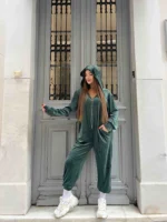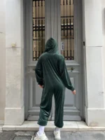 Ολόσωμη βελούδινη φόρμα με κουκούλα και φερμουάρ μπροστά.