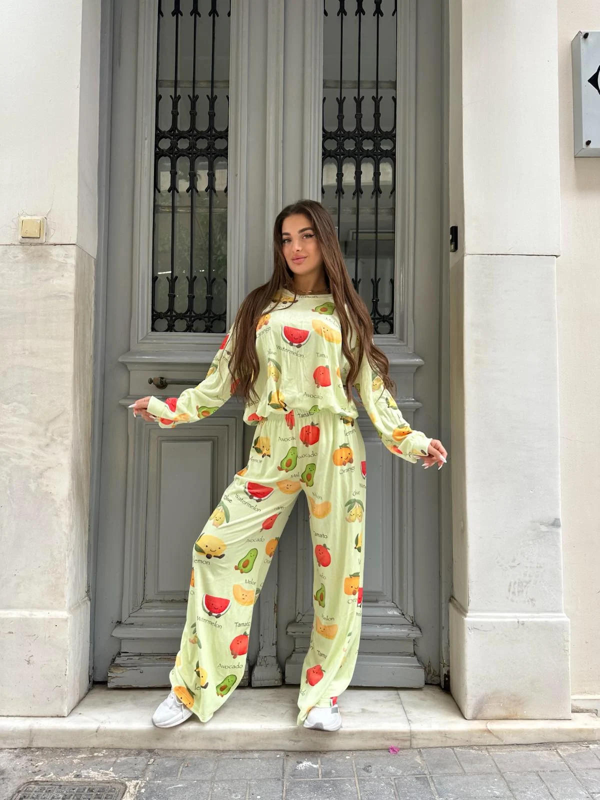 Πράσινη βελούδινη πιτζάμα με παιχνιδιάρικα φρούτα — watermelon, avocado, lemon και άλλα! Άνετη, cozy και χουχουλιάρικη, με λάστιχο στη μέση και κάλυψη έως 3XL.