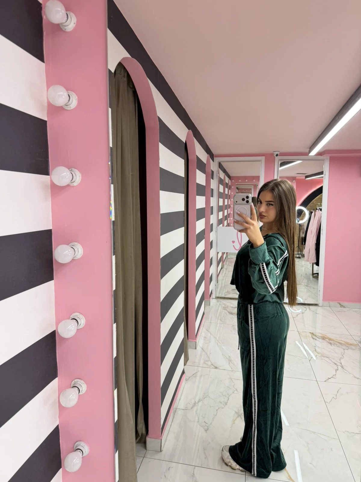 Βελουτέ σετ σε βαθύ πράσινο, με glam λάμψη και άνετη cropped ζακέτα. Το παντελόνι πέφτει ανάλαφρα, χαρίζοντας ύψος και στυλ. Τέλειο για cozy chic εμφανίσεις όλη μέρα.