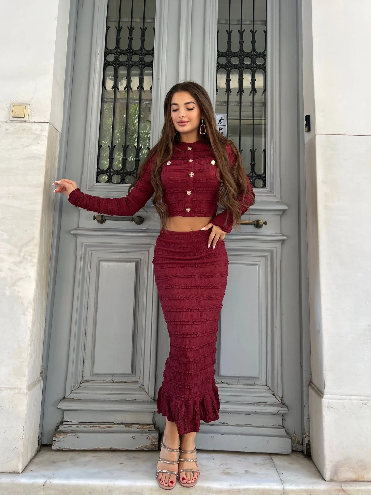 Πλεκτό σετ σε μπορντό απόχρωση, με cropped ζακετάκι και midi φούστα που αγκαλιάζει τη σιλουέτα. Ιδανικό για εμφανίσεις με έντονο χαρακτήρα και elegant διάθεση ✨