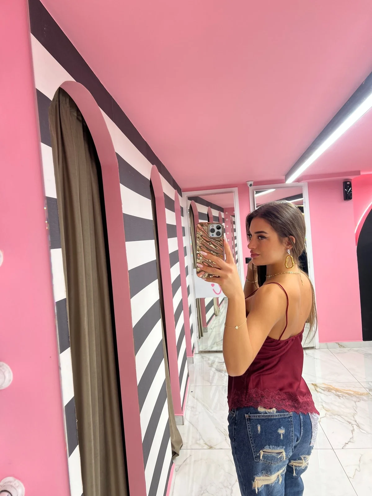 έρινο σατέν τοπ σε βαθύ μπορντό, με ρομαντική δαντέλα και λεπτές τιράντες. Δίνει elegant και σαγηνευτικό touch σε κάθε outfit.