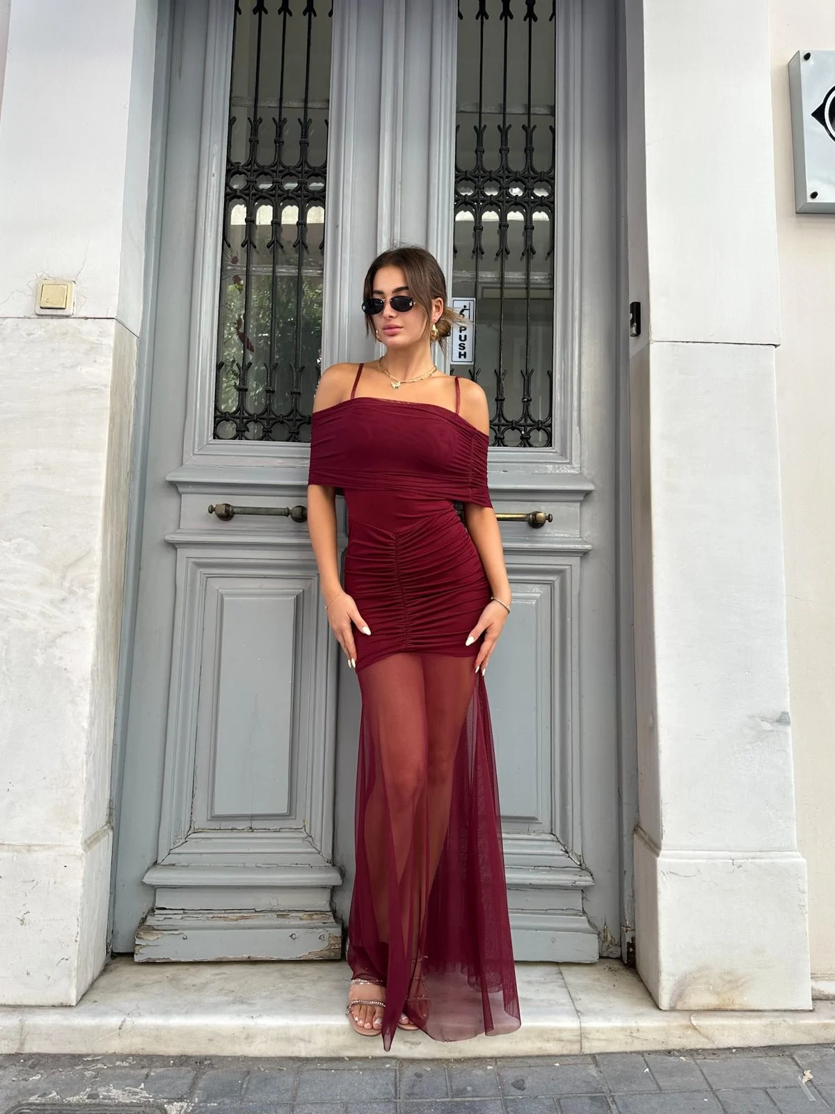 Sexy maxi φόρεμα με σούρα στο μπροστινό μέρος και διαφάνεια στο κάτω τμήμα. Σε βαθύ μπορντό χρώμα, must-have για εντυπωσιακές βραδινές εμφανίσεις.
