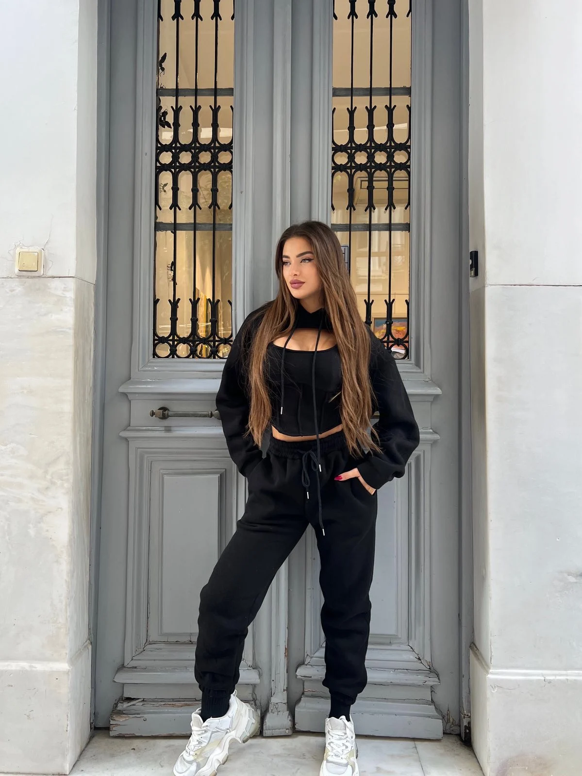 Minimal και σικάτο, το απόλυτο μαύρο σετ για κάθε στιγμή. Αποτελείται από bolero, τοπάκι και φόρμα με λάστιχο στη μέση και στα τελειώματα — casual chic σε όλο του το μεγαλείο.