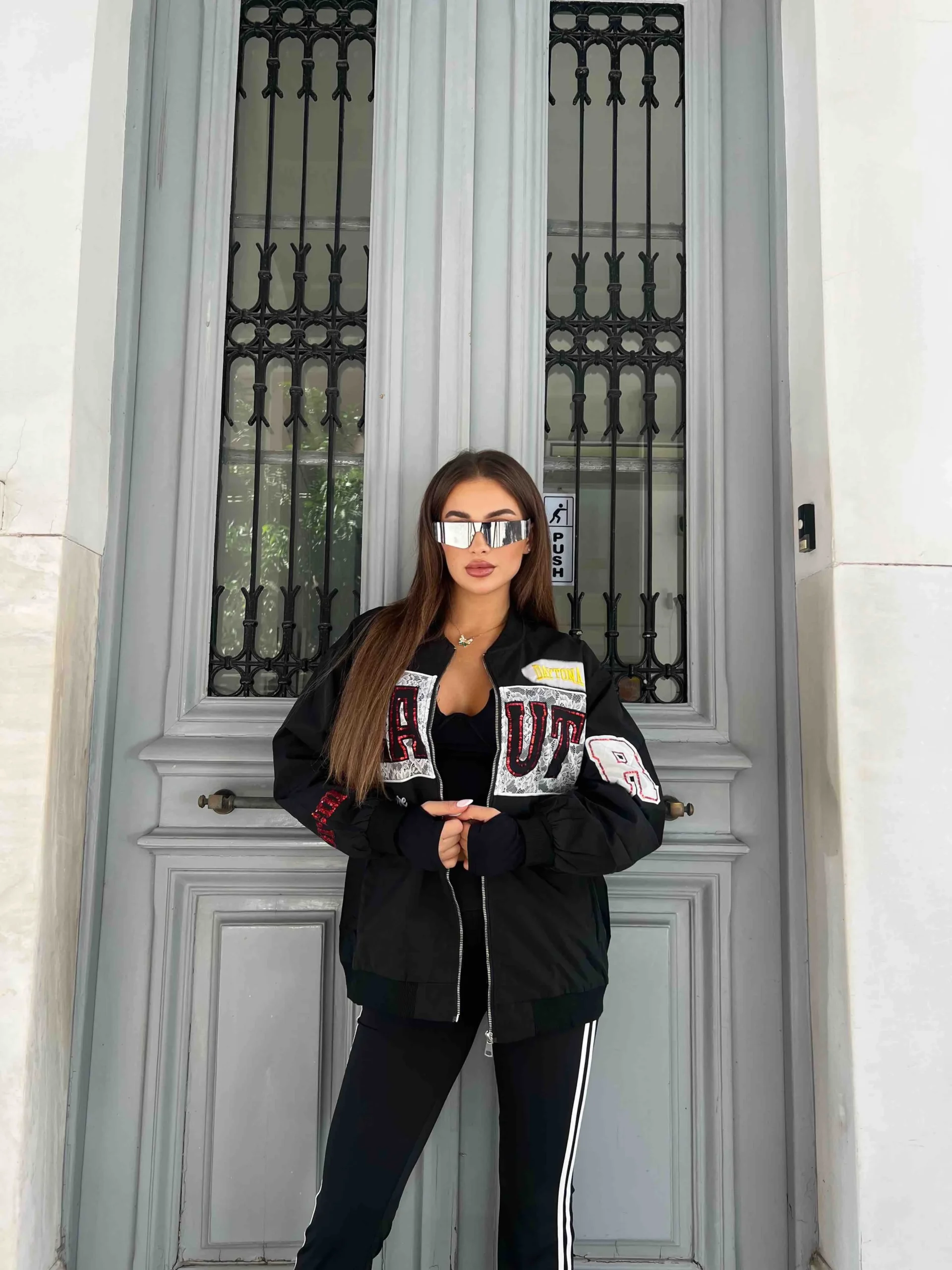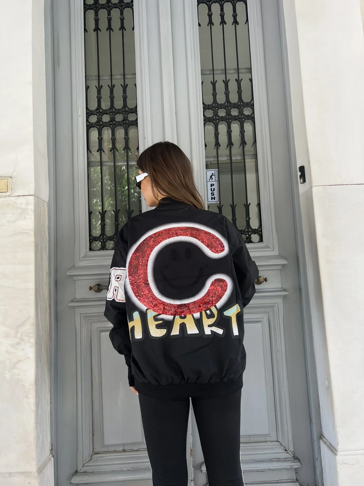 Bomber jacket σε μαύρο χρώμα με εντυπωσιακές λεπτομέρειες από παγιέτες και bold γράμματα. Το πίσω μέρος με το μεγάλο “C HEART” και το χαμογελαστό σύμβολο χαρίζει playful διάθεση με streetwear edge.