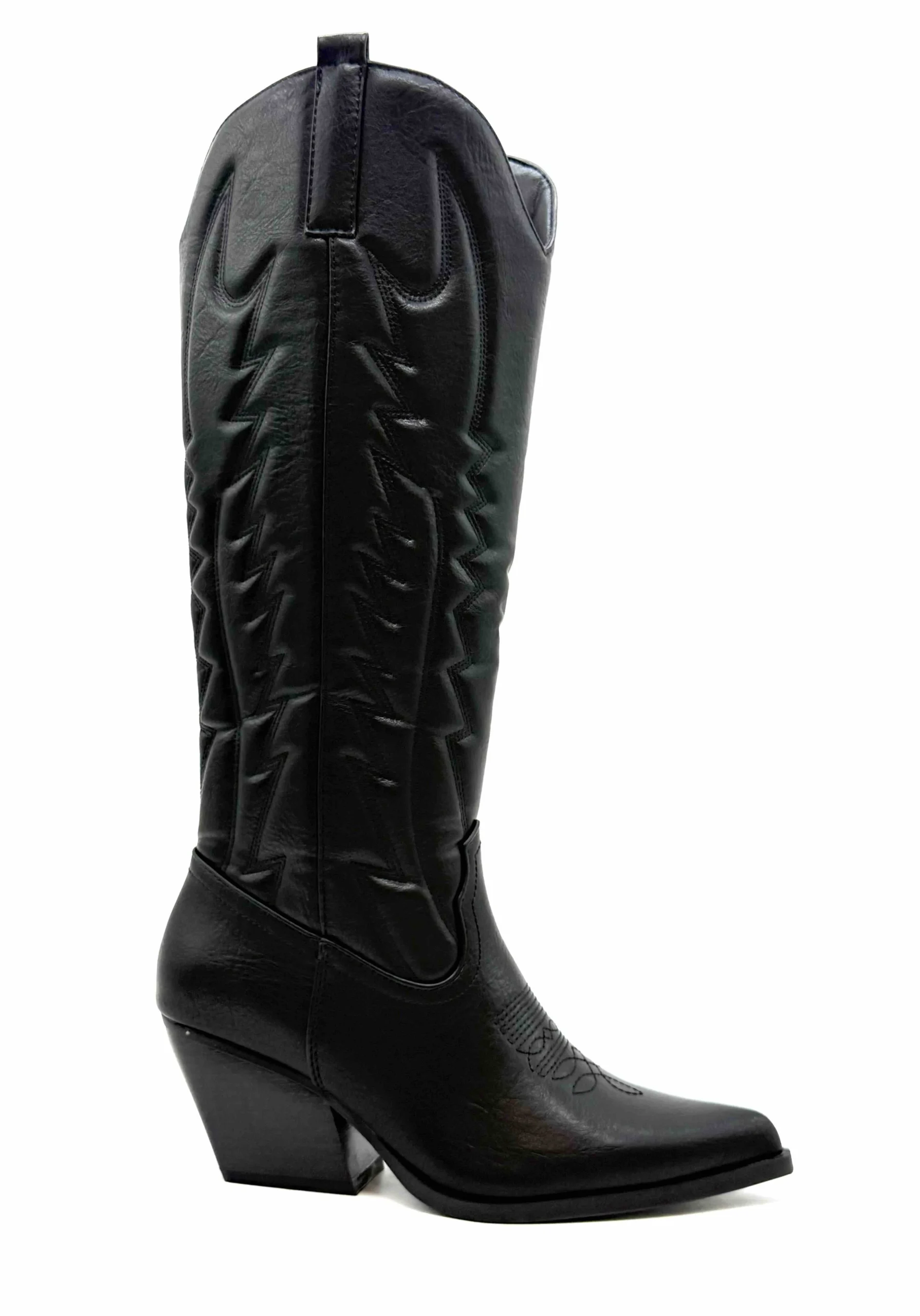 Μαύρες καουμπόικες μπότες με κλασικό western design, μυτερή μύτη και χοντρό τακούνι για άνεση και στυλ. Διαθέτουν εντυπωσιακές ραφές στο πάνω μέρος και στέκονται ψηλά στη γάμπα, χαρίζοντας δυναμικό χαρακτήρα σε κάθε εμφάνιση. Συνδυάζονται ιδανικά με τζιν, φορέματα ή φούστες για μοντέρνο cowboy chic look.