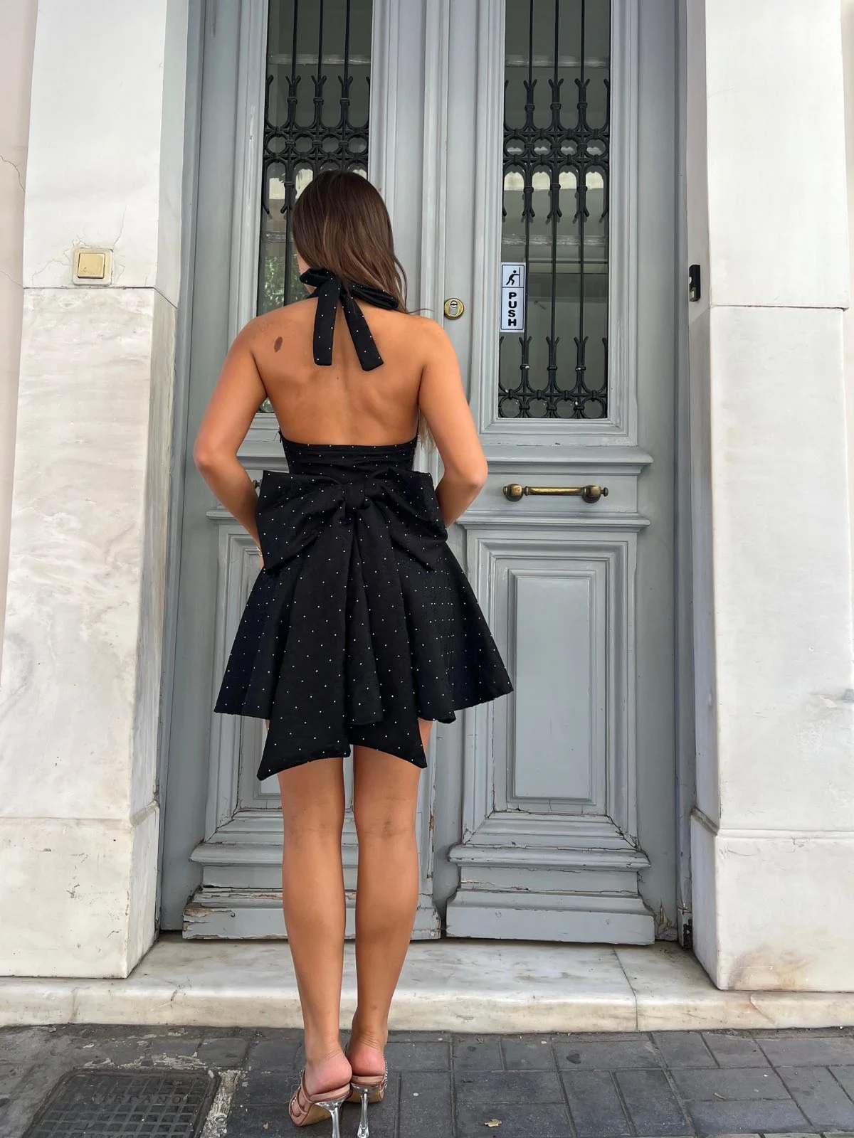 Κλασικό μαύρο μίνι φόρεμα με ανοιχτή πλάτη, στολισμένο με μικρές λαμπερές λεπτομέρειες που του χαρίζουν διακριτική πολυτέλεια. Ο εντυπωσιακός φιόγκος στο πίσω μέρος ολοκληρώνει το look με glamorous χαρακτήρα.