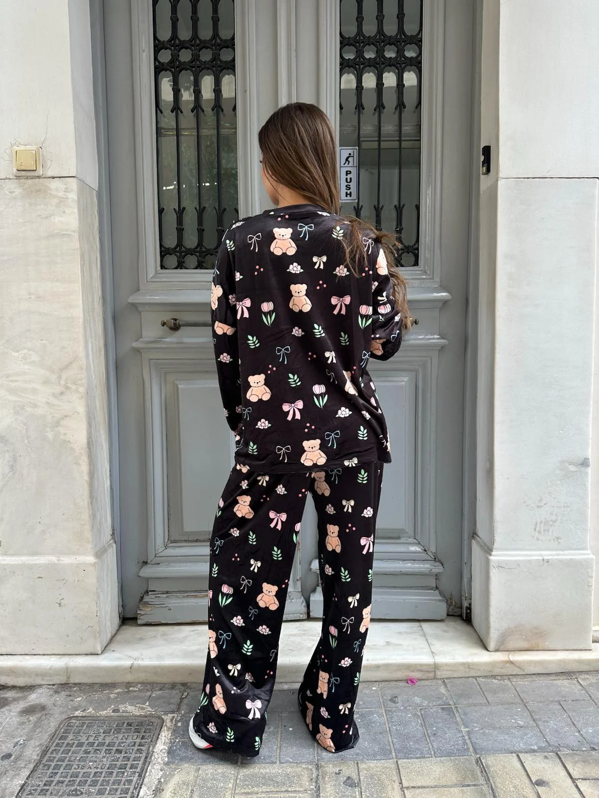 Μαύρη βελούδινη πιτζάμα με ροζ αρκουδάκια, φιογκάκια και λουλουδάκια για girly νυχτερινό look. Εξαιρετικά ελαστική, χουχουλιάρικη και άνετη, με λάστιχο στη μέση και κάλυψη έως 3XL.
