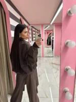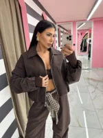 Minimal τζάκετ σε σοκολατί απόχρωση, με χαλαρή εφαρμογή και stylish φερμουάρ. Συνδυάζεται εύκολα με nude ή γήινες αποχρώσεις για ένα elegant athleisure αποτέλεσμα.