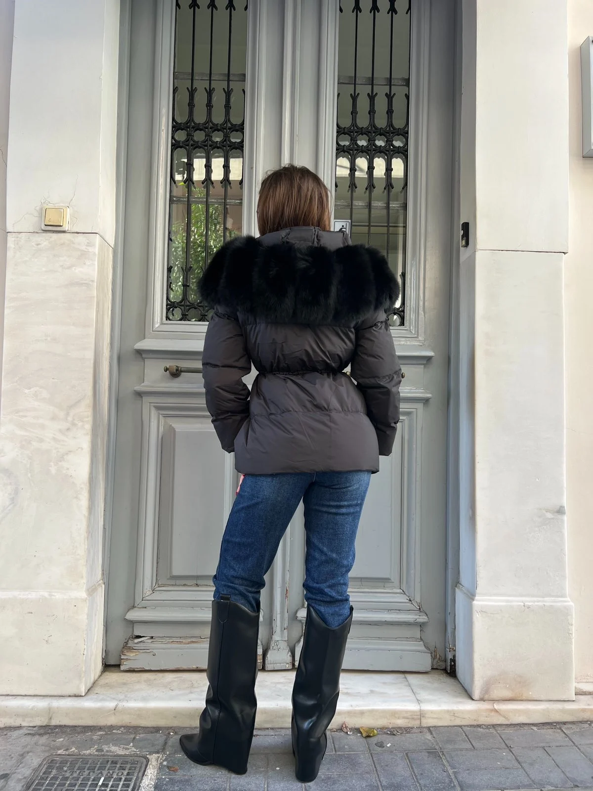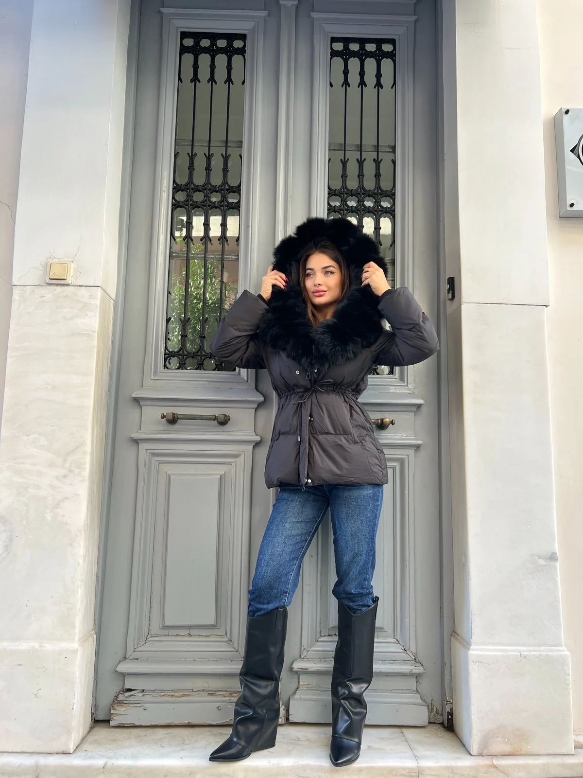 Το Noir Queen Parka είναι η επιτομή της χειμερινής πολυτέλειας. Με αληθινή γούνα σε βαθύ μαύρο τόνο και φαρδιά, εντυπωσιακή γραμμή, προσφέρει μοναδική άνεση και αριστοκρατικό στυλ. Διαθέτει ρυθμιζόμενο κορδόνι στη μέση για τέλεια εφαρμογή και premium φινίρισμα που αποπνέει γοητεία.