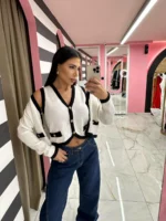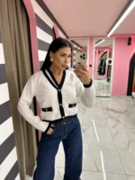 Πλεκτό τοπ σε λευκή βάση με μαύρες λεπτομέρειες και gold κουμπιά. Κομψό και elegant, συνδυάζεται εύκολα με denim ή παντελόνια για effortless classy εμφανίσεις.