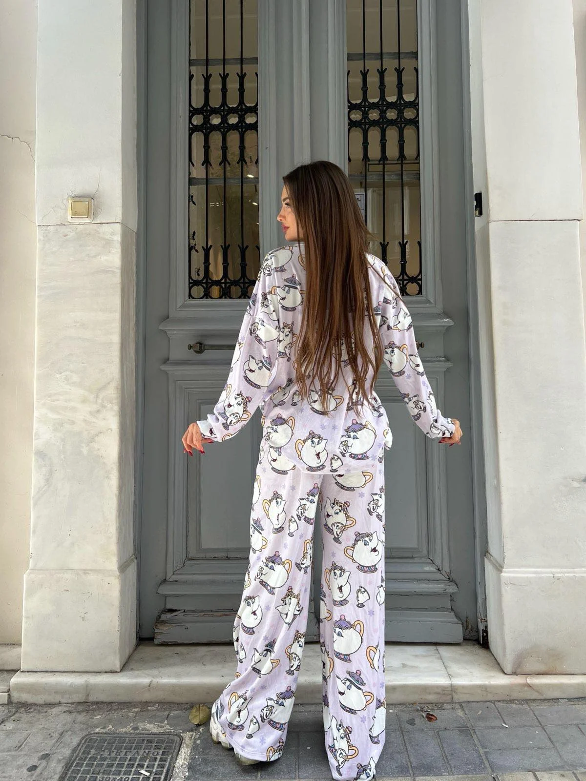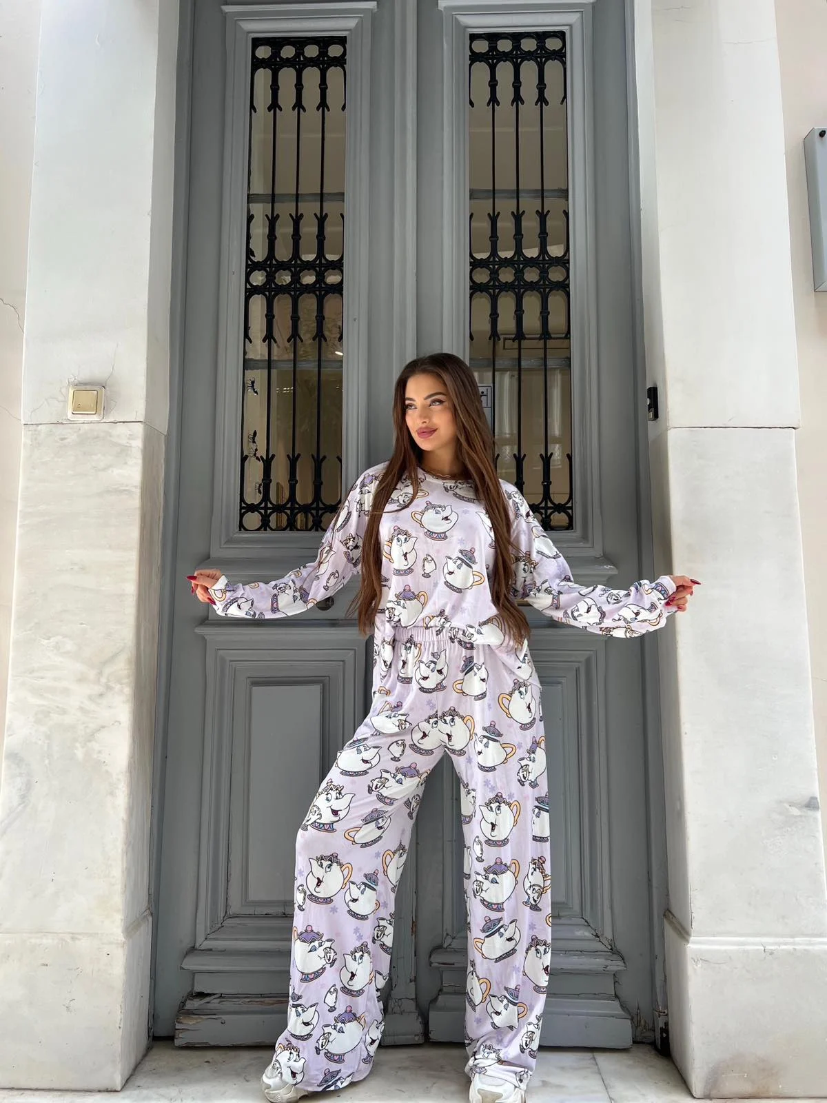 Λιλά πιτζάμα με γλυκό σχέδιο από τσαγιέρες και φλιτζάνια. Cozy, girly και υπέροχη για στιγμές χαλάρωσης στο σπίτι.