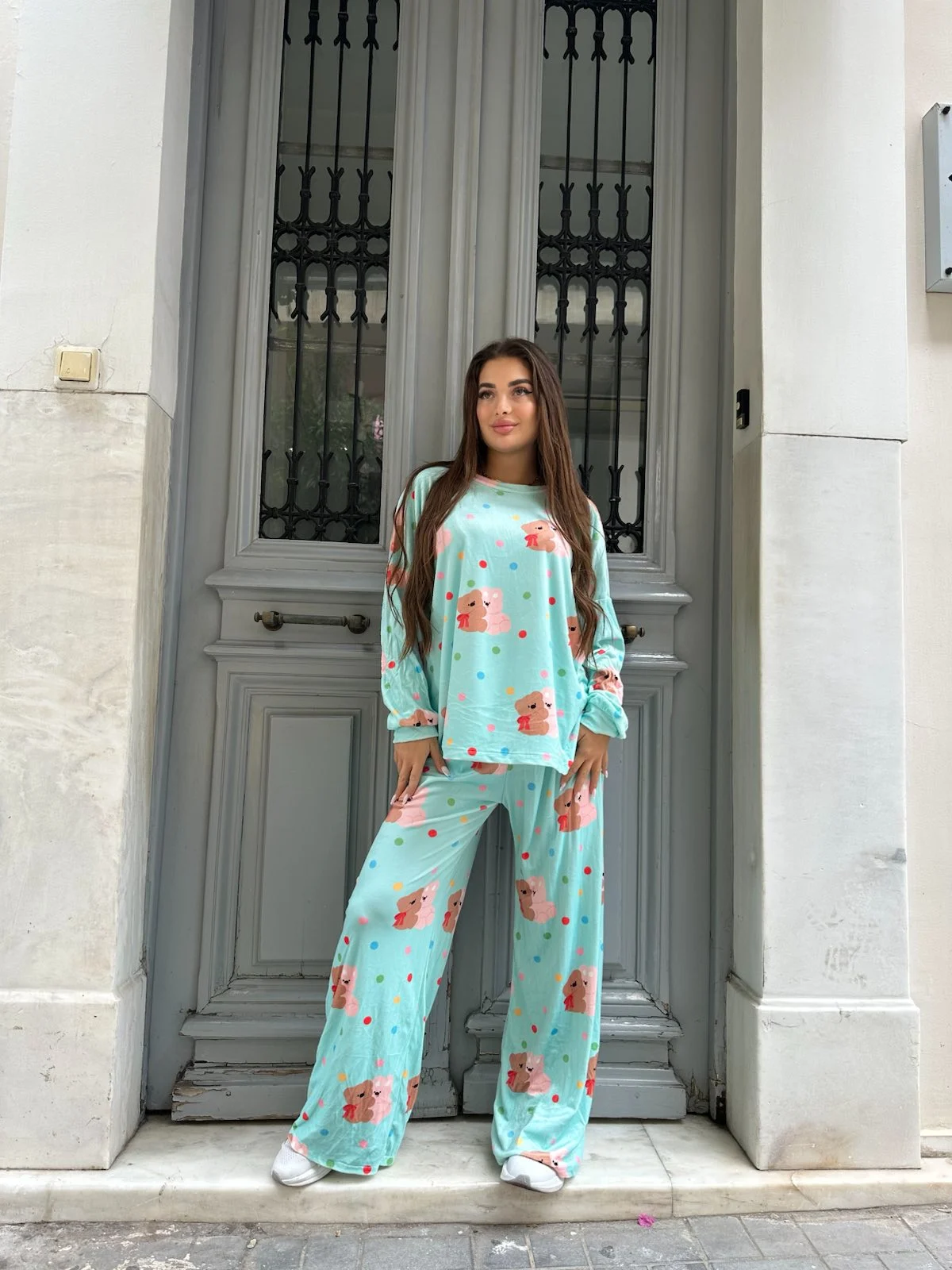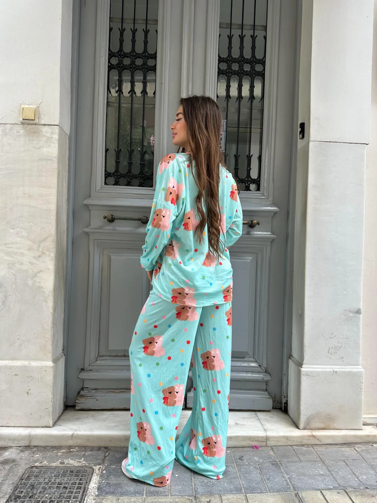 αλάζια βελούδινη πιτζάμα με πολύχρωμες βούλες και αρκουδάκια — παιχνιδιάρικη και cute! Ζεστή, πολύ ελαστική με λάστιχο στη μέση και κάλυψη έως 3XL.