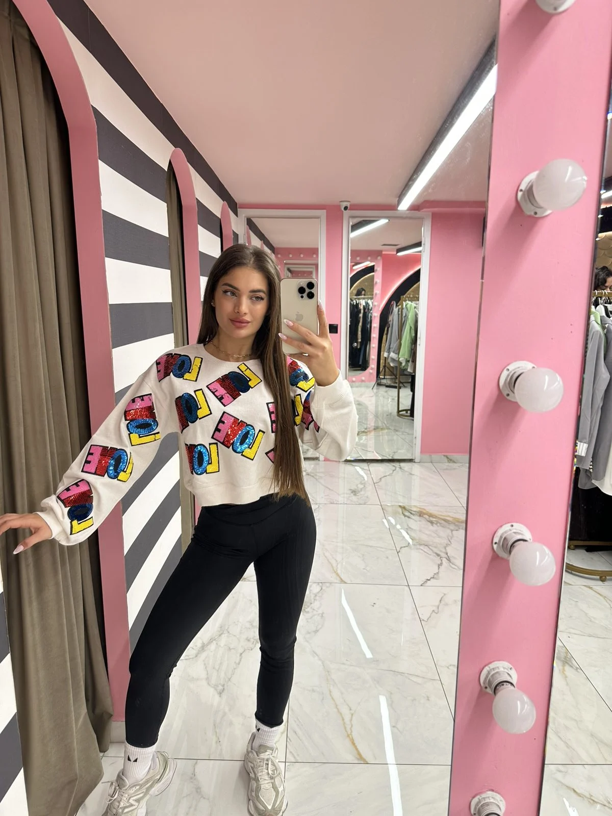 Λευκό cropped φούτερ με πολύχρωμα pop-art γράμματα “LOVE” σε όλη την επιφάνεια. Fun, playful και τέλειο για casual εμφανίσεις με προσωπικότητα. Συνδυάζεται άψογα με τζιν, κολάν ή φόρμες.