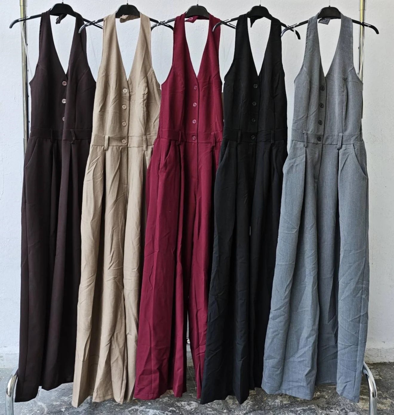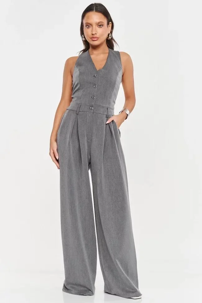 Ολόσωμη φόρμα με κουμπιά και γιακά τύπου γιλέκου, σε ίσια φαρδιά γραμμή που κολακεύει κάθε σιλουέτα. Διαθέτει λάστιχο στη μέση για άνετη εφαρμογή και τσέπες στο πλάι. Ένα κομμάτι που συνδυάζει κομψότητα και δυναμισμό, ιδανικό για chic εμφανίσεις από το πρωί ως το βράδυ.