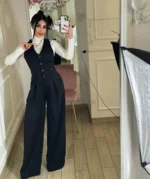 Ολόσωμη φόρμα με κουμπιά και γιακά τύπου γιλέκου, σε ίσια φαρδιά γραμμή που κολακεύει κάθε σιλουέτα. Διαθέτει λάστιχο στη μέση για άνετη εφαρμογή και τσέπες στο πλάι. Ένα κομμάτι που συνδυάζει κομψότητα και δυναμισμό, ιδανικό για chic εμφανίσεις από το πρωί ως το βράδυ.