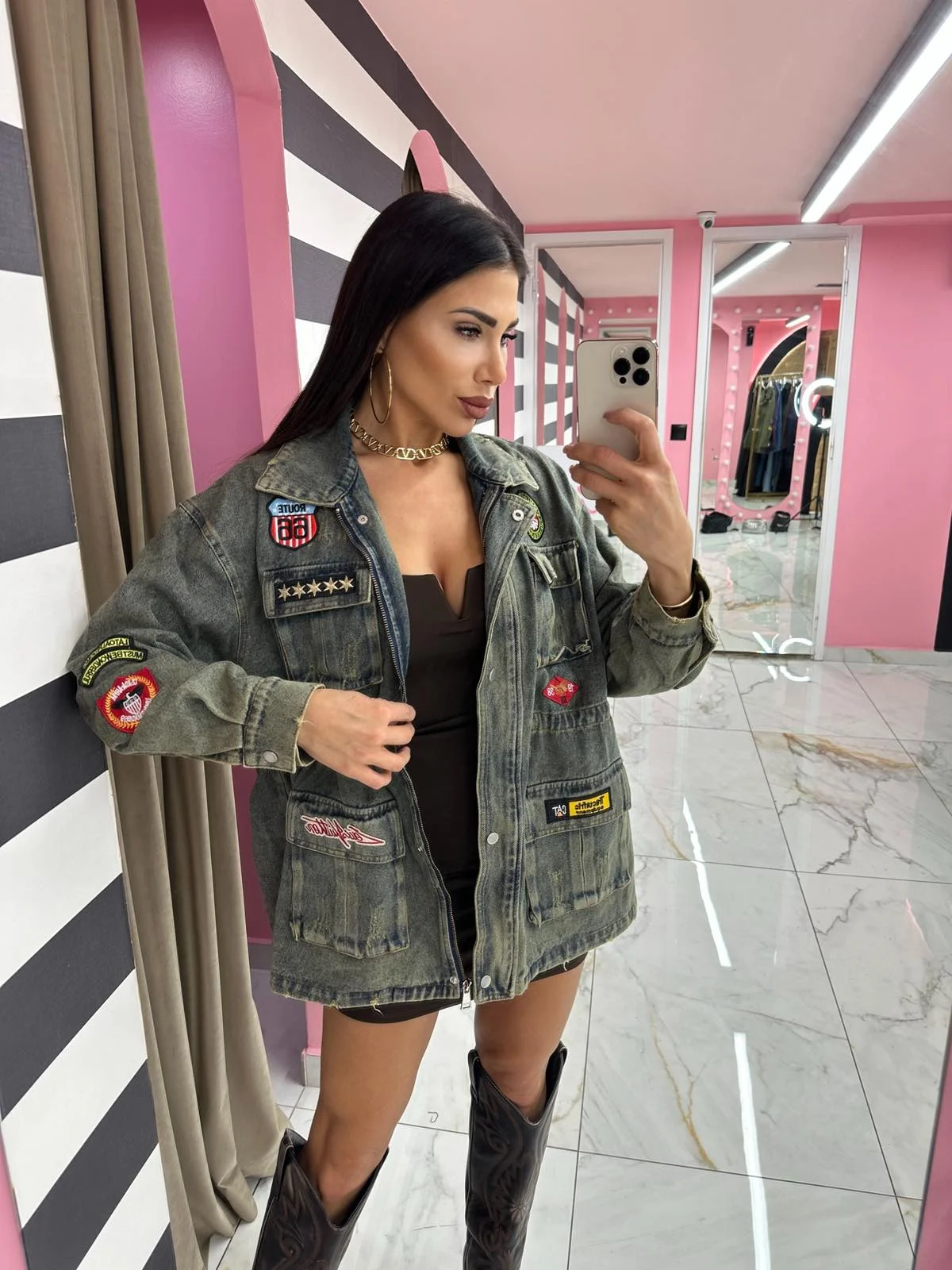 Denim τζάκετ με μοναδικά patches και vintage washed απόχρωση για αυθεντικό street look. Διαθέτει φερμουάρ, πολλές τσέπες και relaxed εφαρμογή που καλύπτει έως XL. Το απόλυτο statement κομμάτι για bold εμφανίσεις — συνδυάζεται τέλεια με φόρεμα, δερμάτινο παντελόνι ή total denim look.