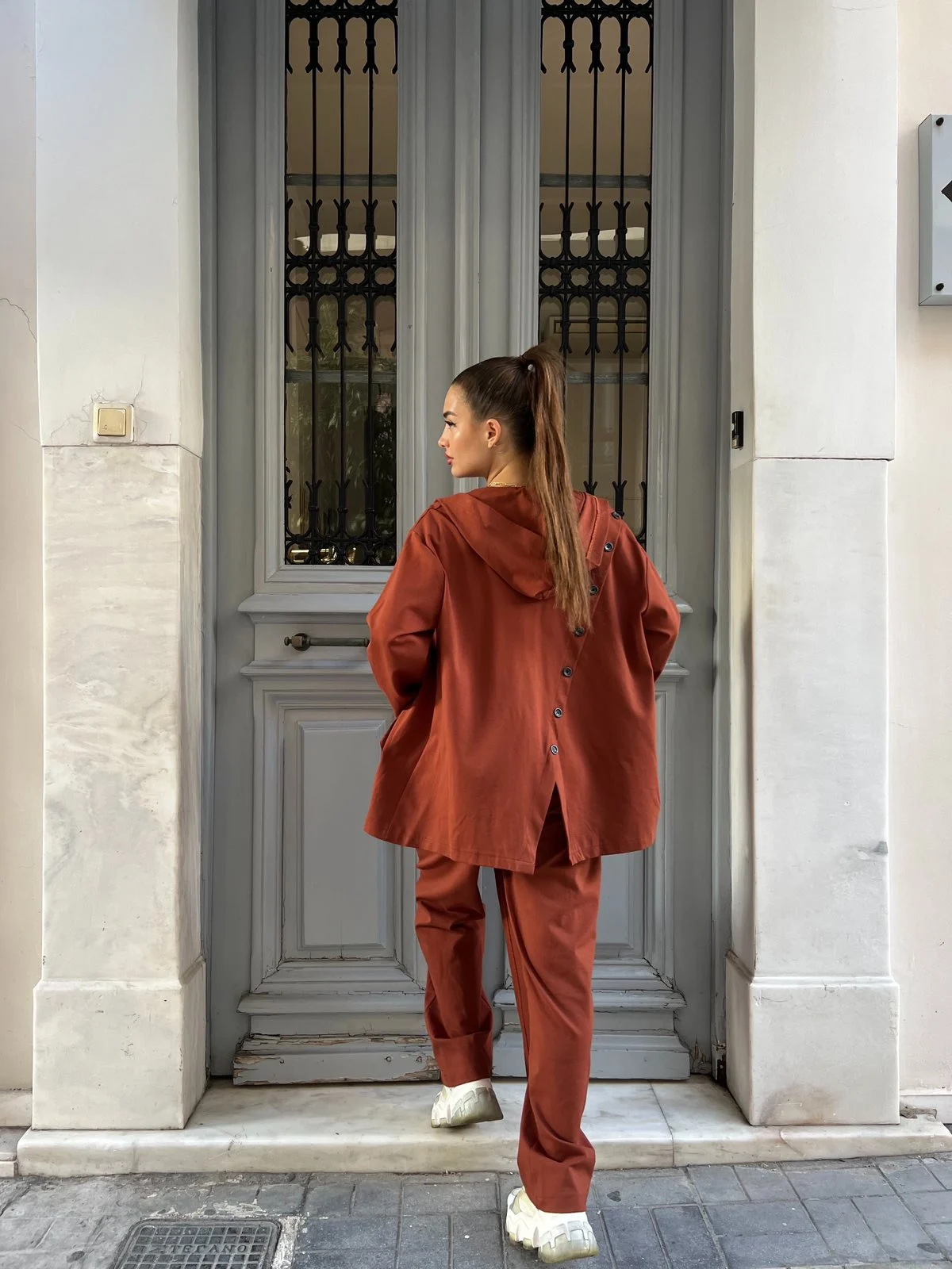 Σετ σε εντυπωσιακή απόχρωση κεραμιδί με κουμπιά πίσω και φαρδιά γραμμή. Απόλυτα άνετο, με street-chic χαρακτήρα που ξεχωρίζει.
