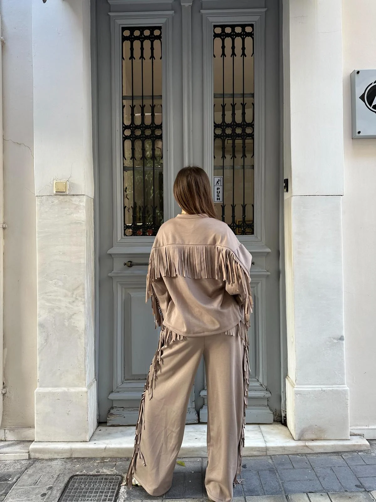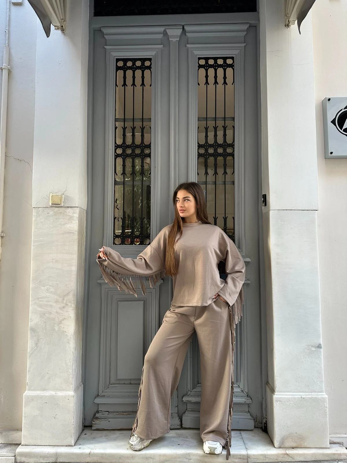 Απαλό μπεζ σετ με boho κρόσια στη μπλούζα και στο πλάι του παντελονιού. Ελαστικό ύφασμα, cozy αίσθηση και wide-leg γραμμή που δίνει chic καθημερινό αποτέλεσμα.