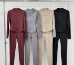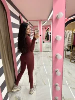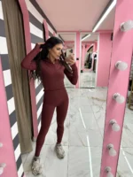 Athleisure σετ σε εφαρμοστή γραμμή, με crop ζακέτα φερμουάρ και ψηλόμεσο κολάν που αγκαλιάζει το σώμα. Διαθέτει άνετο, ελαστικό ύφασμα που αναδεικνύει τη σιλουέτα και λεπτομέρεια με θηλιές στα μανίκια για extra sporty στυλ. Ιδανικό για καθημερινές εμφανίσεις & γυμναστήριο