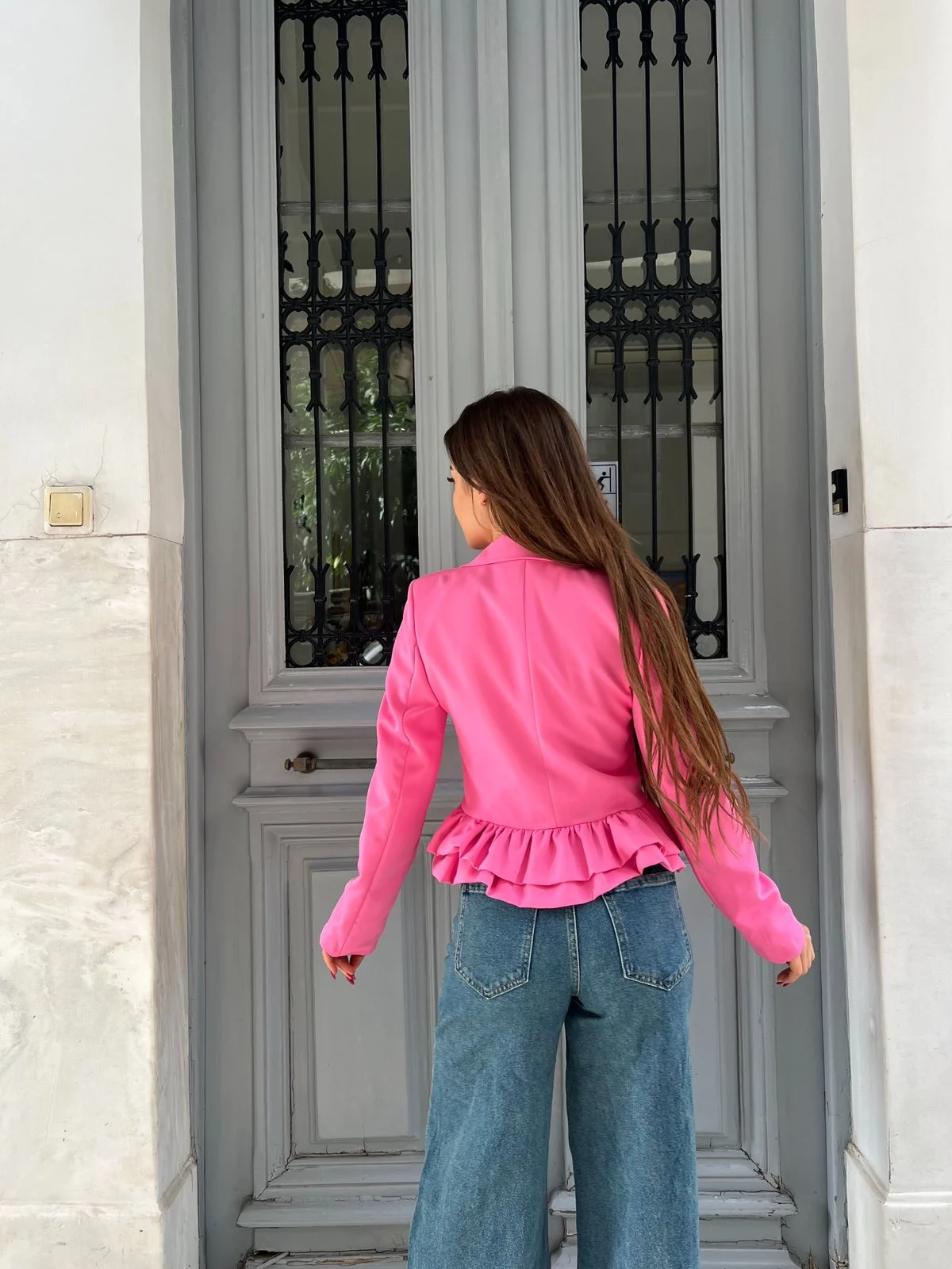 Satin look τοπ σε έντονο ροζ με βαθύ ντεκολτέ και βολάν στη μέση. Θηλυκό, chic και απόλυτα trend — ιδανικό για να συνδυαστεί με jeans ή φούστες.