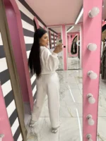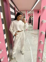 Λευκό σετ φούτερ και παντελόνι που αποπνέει φρεσκάδα και κομψότητα. Το απόλυτο cozy outfit για all-day casual εμφανίσεις με καθαρό, minimal χαρακτήρα.