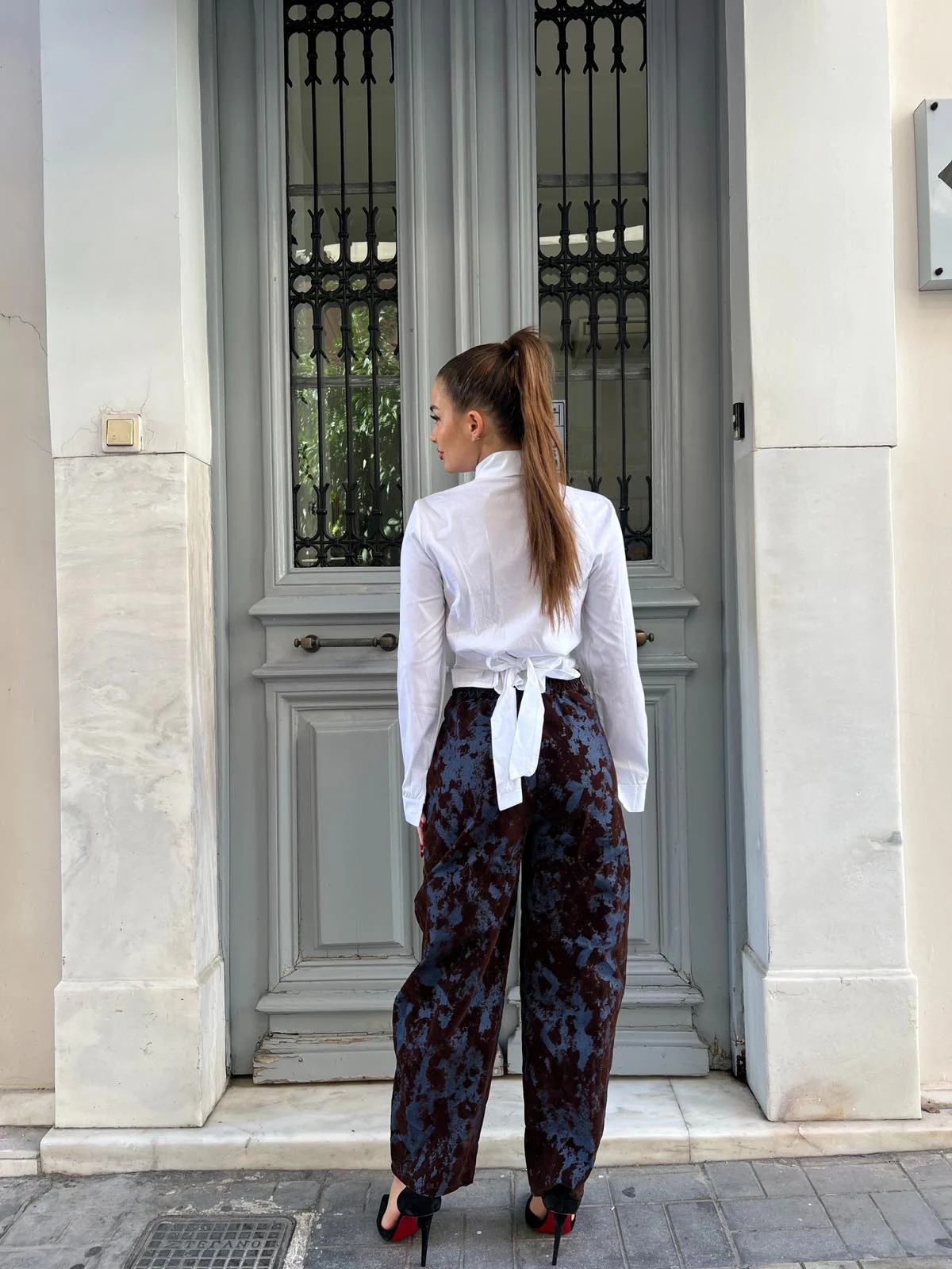 Παντελόνι από απαλό βελούδο σε σοκολατί απόχρωση με σκούρα μοτίβα. Η ψηλόμεση γραμμή και το άνετο κόψιμο χαρίζουν κομψή σιλουέτα με effortless αποτέλεσμα. Συνδύασέ το με πουκάμισο ή κορμάκι για ένα statement look που ξεχωρίζει.