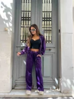 Βελούδινο σετ σε έντονο μοβ που συνδυάζει άνεση και στυλ. Ιδανικό για καθημερινές αλλά και αθλητικές εμφανίσεις.