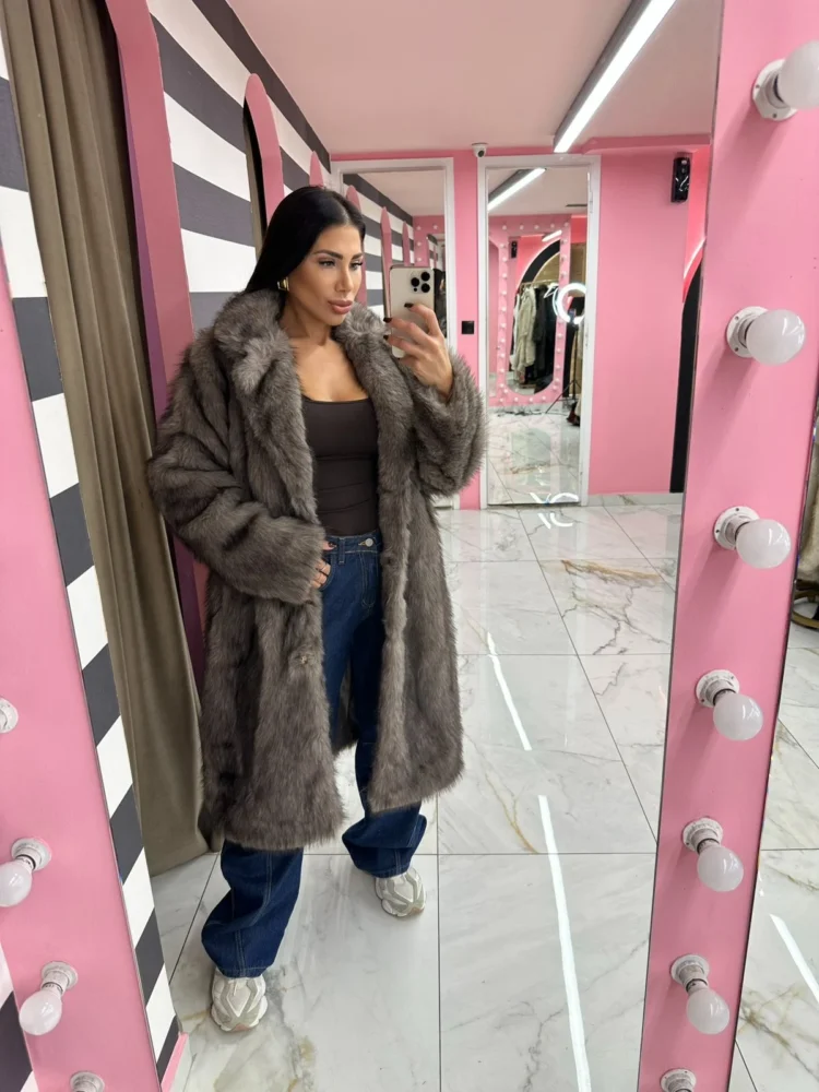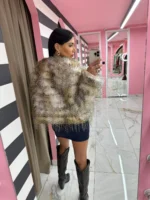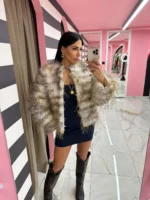 Εντυπωσιακή οικολογική γούνα σε γήινες αποχρώσεις με εφέ φτερού, που χαρίζει μοναδικό στυλ και πολυτέλεια. Κλείνει με φερμουάρ για άνεση και πρακτικότητα.