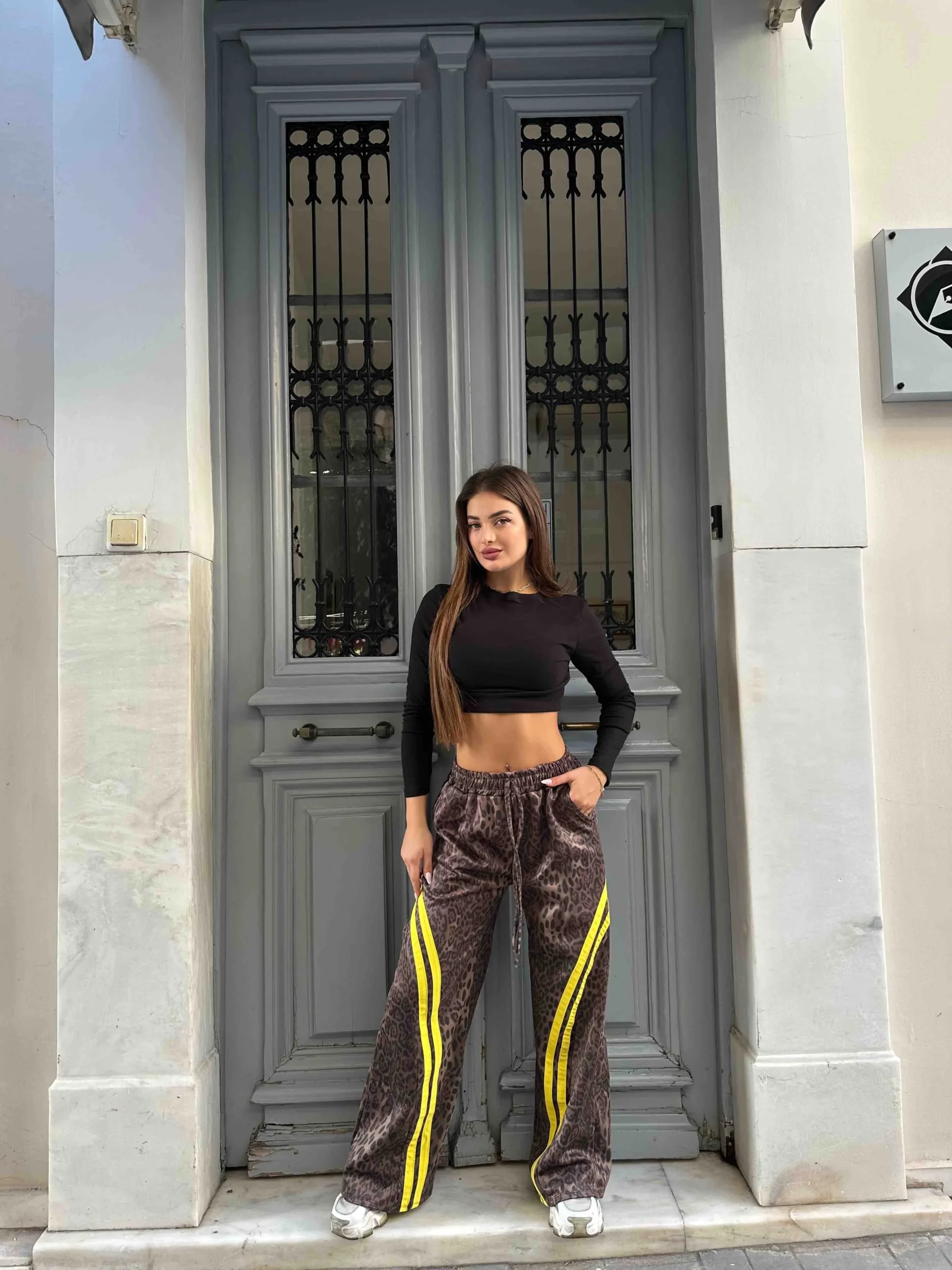 Leopard παντελόνι με έντονη neon κίτρινη διπλή γραμμή στο πλάι. Ultra άνετο, ελαστικό και wide-leg για άριστη κίνηση. Μοναδικό κομμάτι για statement street looks.