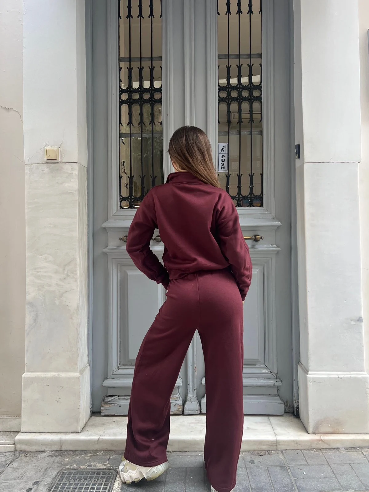 Φόρμα σε ζεστό μπορντό τόνο, με μαλακό ύφασμα και ελαστική εφαρμογή. Απόλυτα άνετη και σικάτη επιλογή για cozy μέρες και βραδινές βόλτες.
