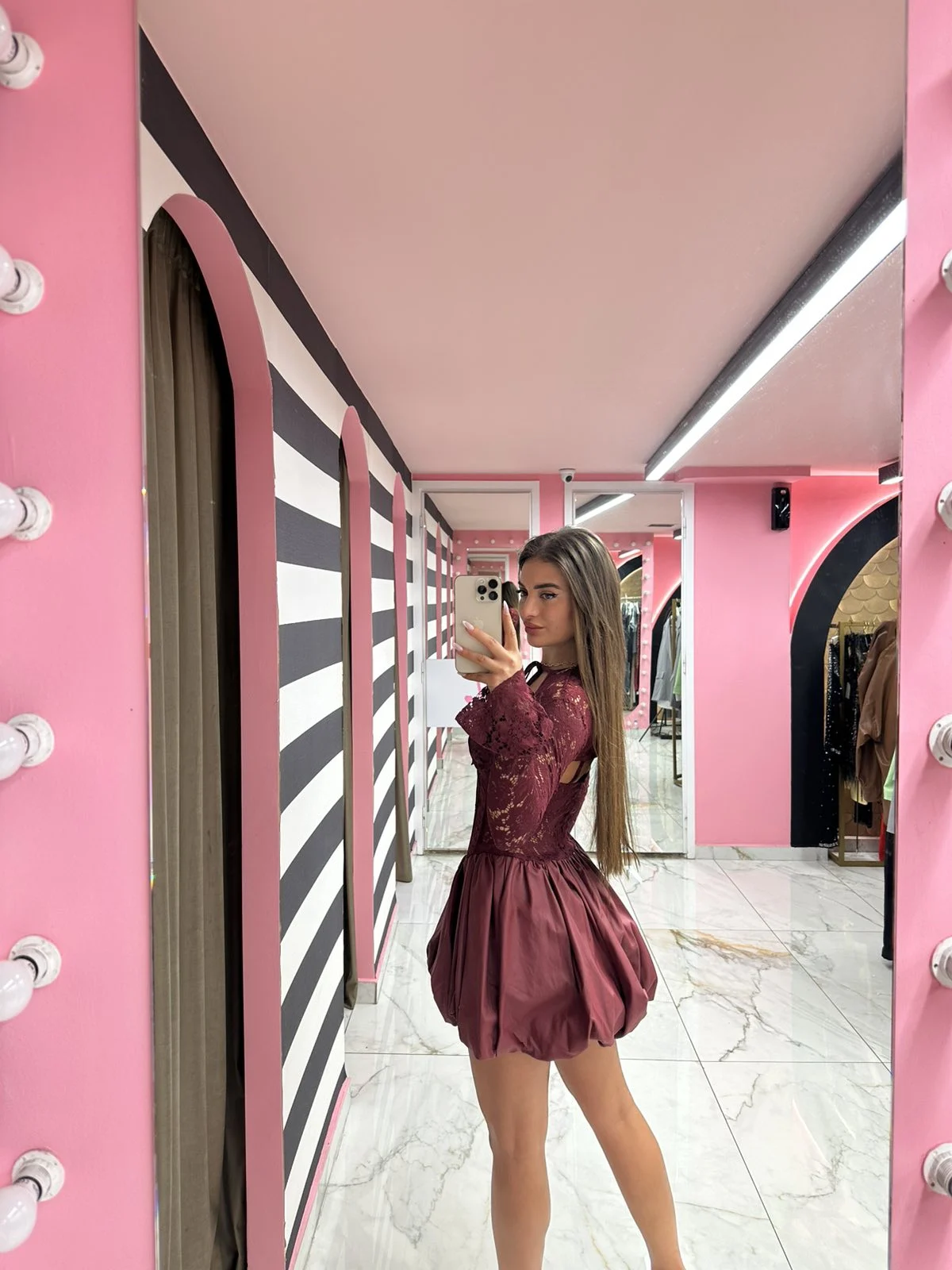 Εντυπωσιακό mini φόρεμα σε βαθύ wine χρώμα με δαντελένια μανίκια, κορσέ μπούστο και balloon φούστα. Το δέσιμο στον λαιμό δίνει extra ρομαντικό και αριστοκρατικό ύφος. Ελαστικό, θηλυκό και απόλυτα statement — ιδανικό για βραδινές εμφανίσεις και events.